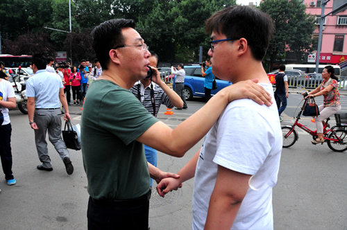 高考第一天,山东省实验中学门口,家长为考生加油打气。