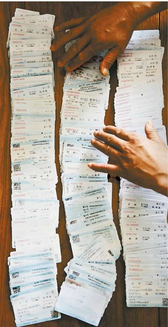 过去三年,潘世友几乎每个周末都要去杭州看望上高中的女儿,积攒下200多张火车票。