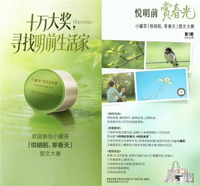 为了让这份春日的美好被更多人看见和分享,据悉,小罐茶官方特别发起“悦明前,享春天”图文大赛活动,邀请每一位懂生活、爱春日的你,共赴这场春日之约。用镜头定格春光,用文字诉说美好,让那些因茶而鲜活的悦己时刻,成为这个春天最温柔的注脚。